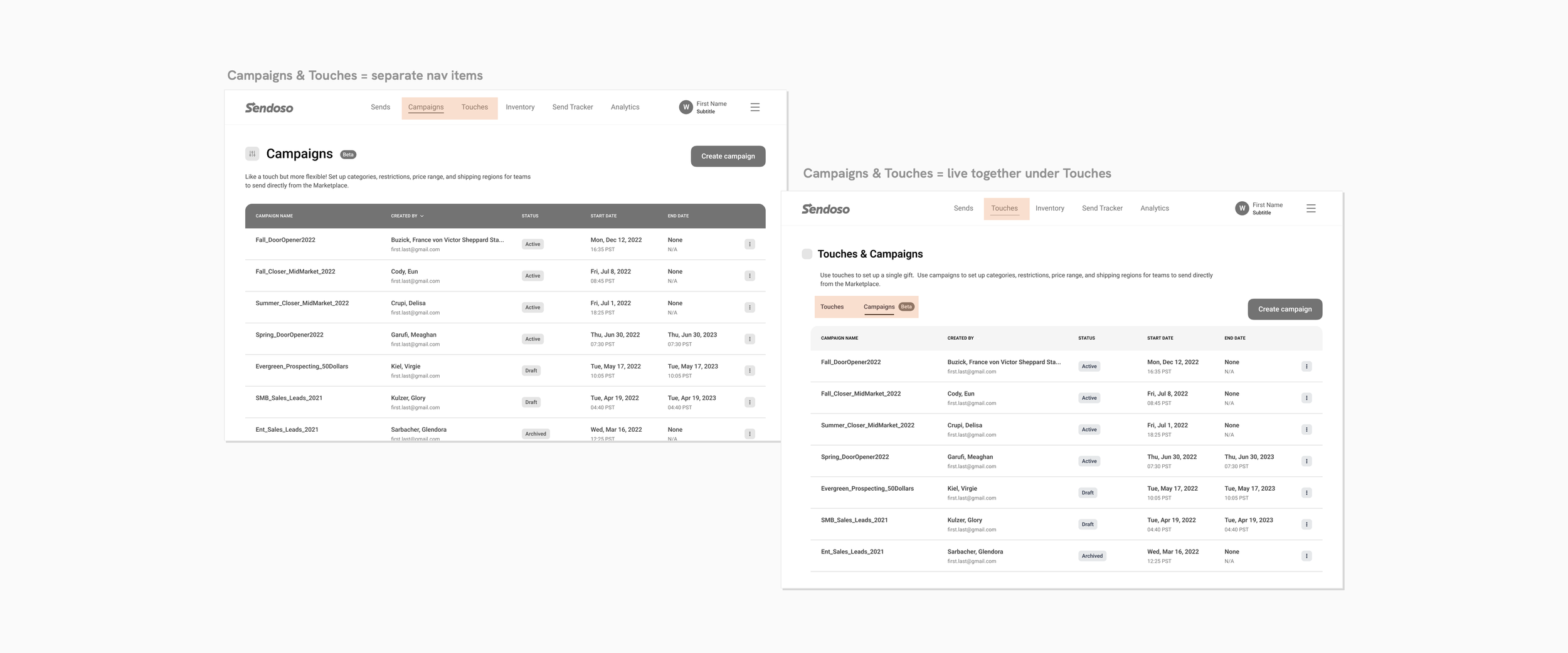 Functionally, Touches were only built to accommodate a single direct gift item. We needed a new construct that would allow multiple gifts or a set of gifts as defined by certain parameters. Until we were able to migrate all the old Touches into new Campaigns, the two would need to live side-by-side. This meant that our testing needed to probe on how users might navigate these two similar (but functionally quite different) options.